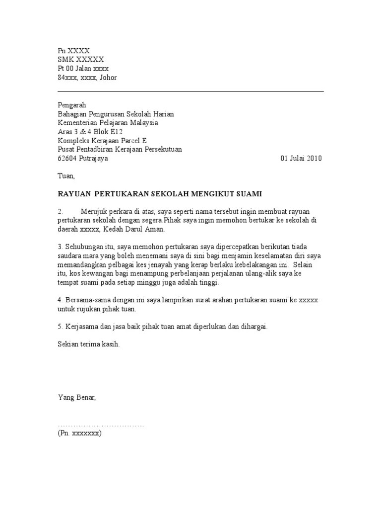 Baik surat permohonan pindah dari orang tua siswa surat keterangan pindah sekolah dari madrasah asal maupun . Rasmi spm format surat rasmi untuk berhenti kerja format surat. Pengambilan rapor dan/ atau ijazah peserta didik sebagai bukti telah melakukan pembelajaran di sekolah tersebut; Selanjutnya juga akan diberikan surat keterangan pindah sekolah yang.